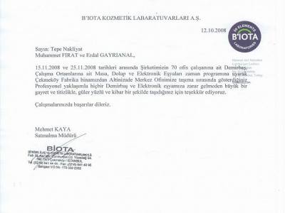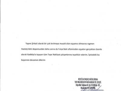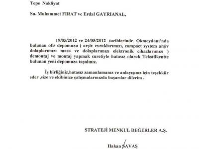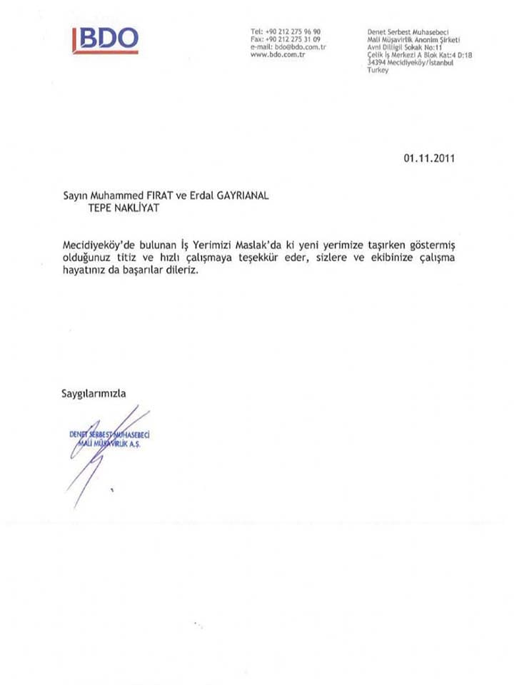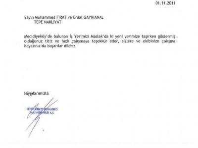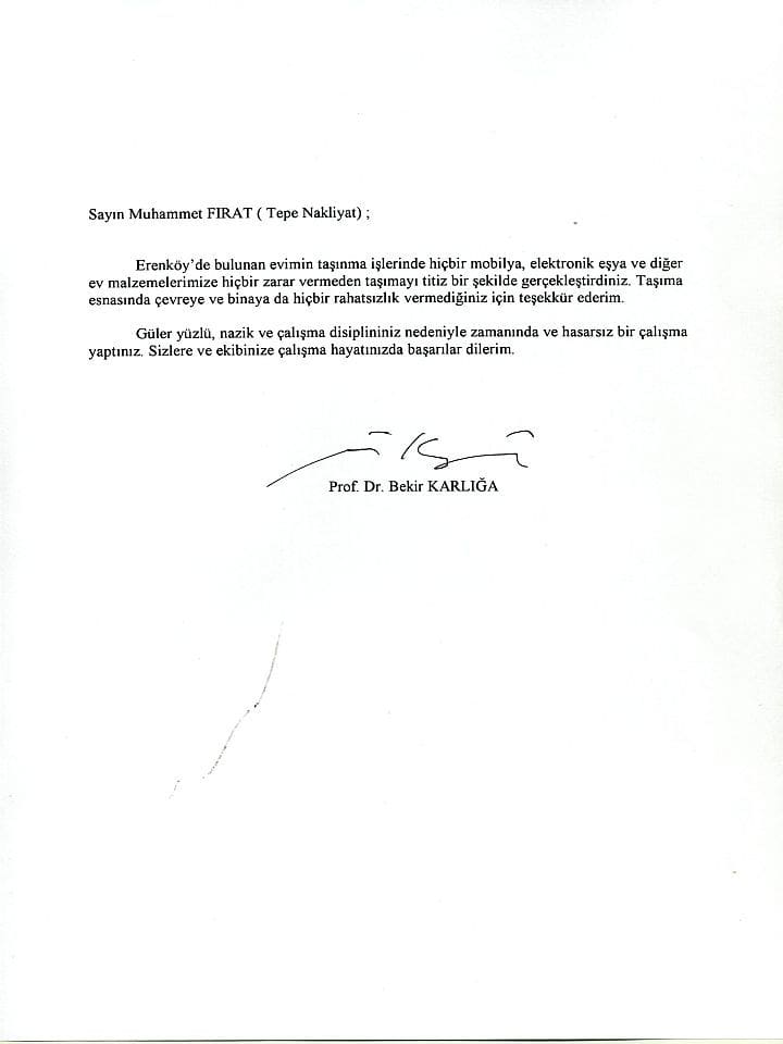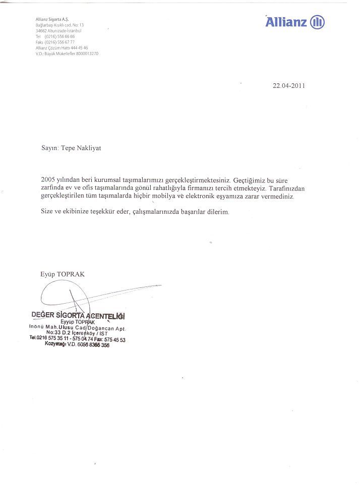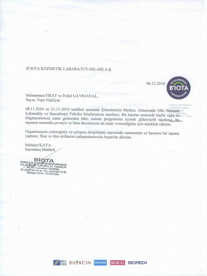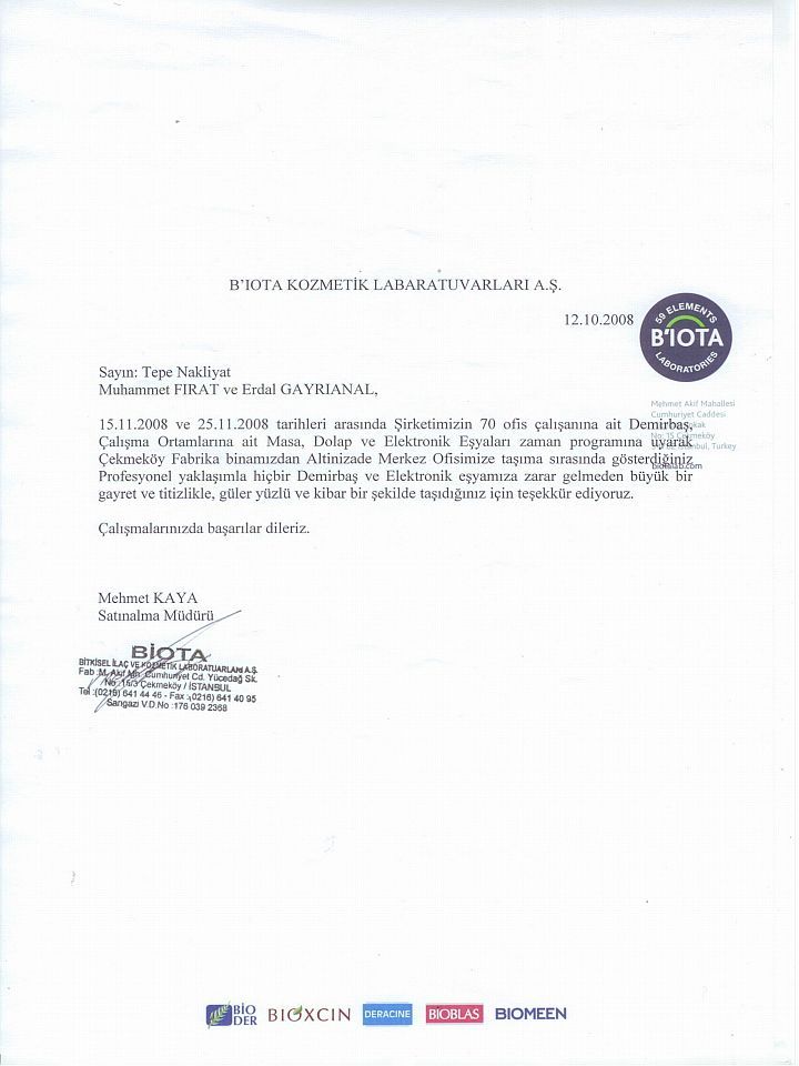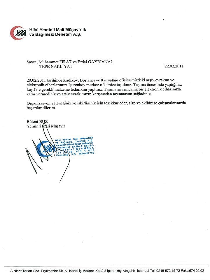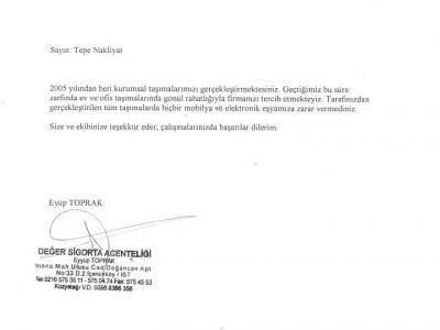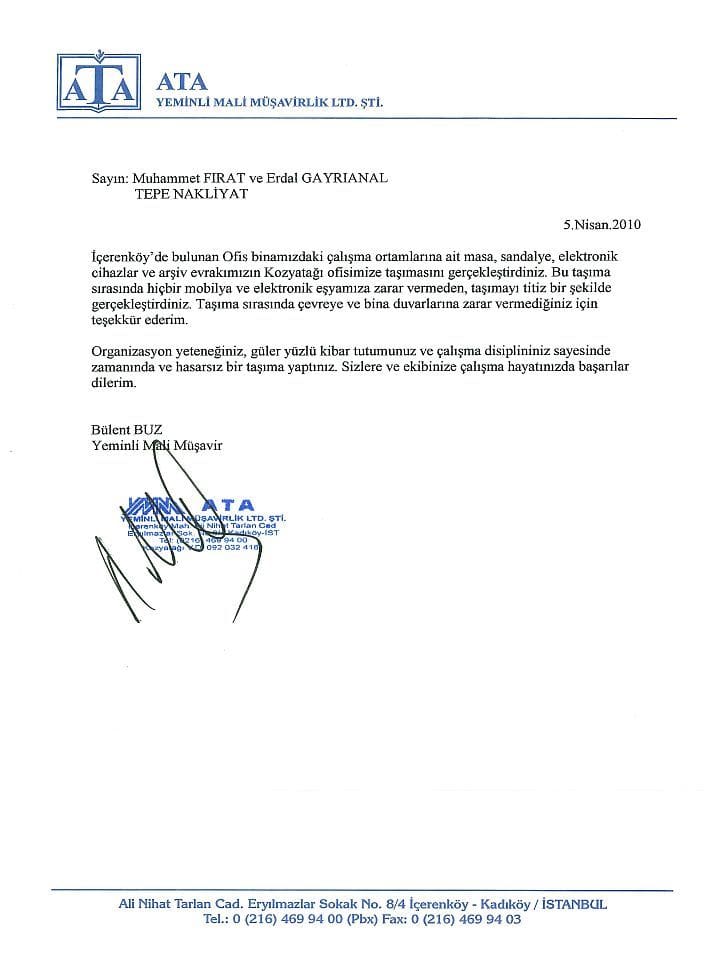 Tepe Nakliyat, hizmet verdiği kişi ve kurumların takdirini kazanmış ender tavsiyeli evden eve nakliyat firmalarındandır. Referanslar bir şirketin verdiği hizmetin kalitesini ve niteliğini belgeleyen resmi yazılardır. Kişisel ve Kurumsal taleplerinizde firma seçiminde önemli bir yere sahip olan referanslar Kurumsallaşmanın da göstergelerindendir. İsimlerini yazdığımız tüm kurum ve şahısları arayarak hizmetimizin kalitesini sorgulayabilir, öğrenebilirsiniz. Referanslarımızın tamamı şeffaf ve orijinaldır. Bazı refeans mektuplarımız aşağıdadır.